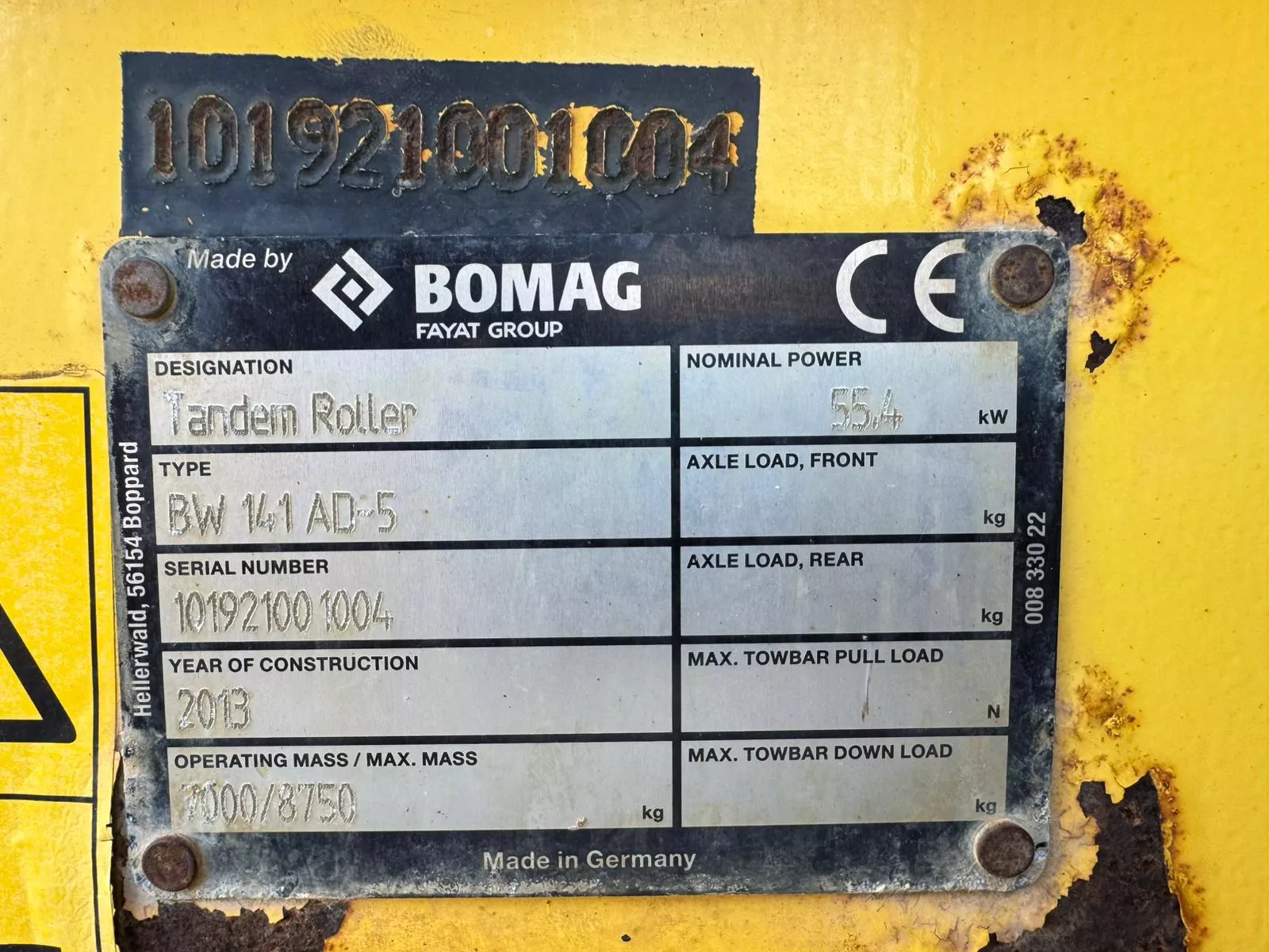 This Bomag BW141AD-5 tandem roller, built in Germany in 2013, is available for sale at BIG Machinery in the Netherlands.