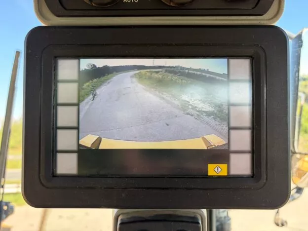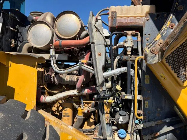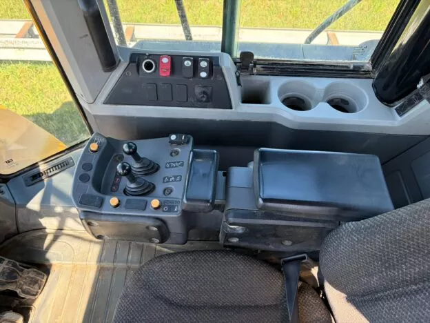 The machine is equipped with a C9.3 engine (247 kW) and features 4×4 drive, joystick steering, and a rear-view camera.