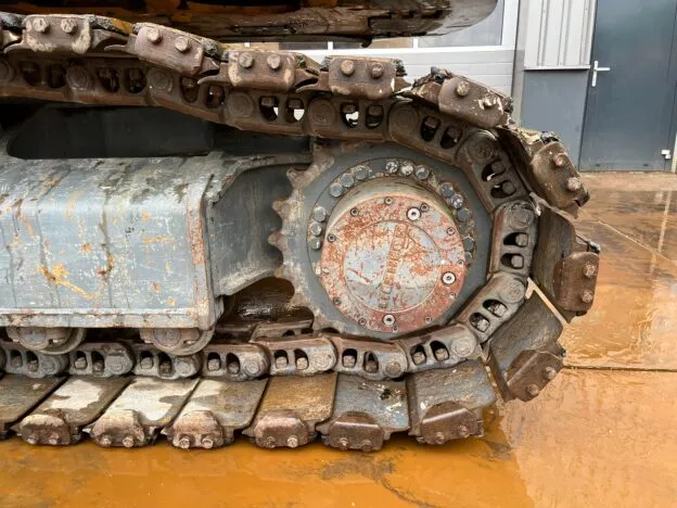 It features a high air-conditioned cabin for excellent visibility and operator comfort, and runs on rubber tracks for stability and mobility.